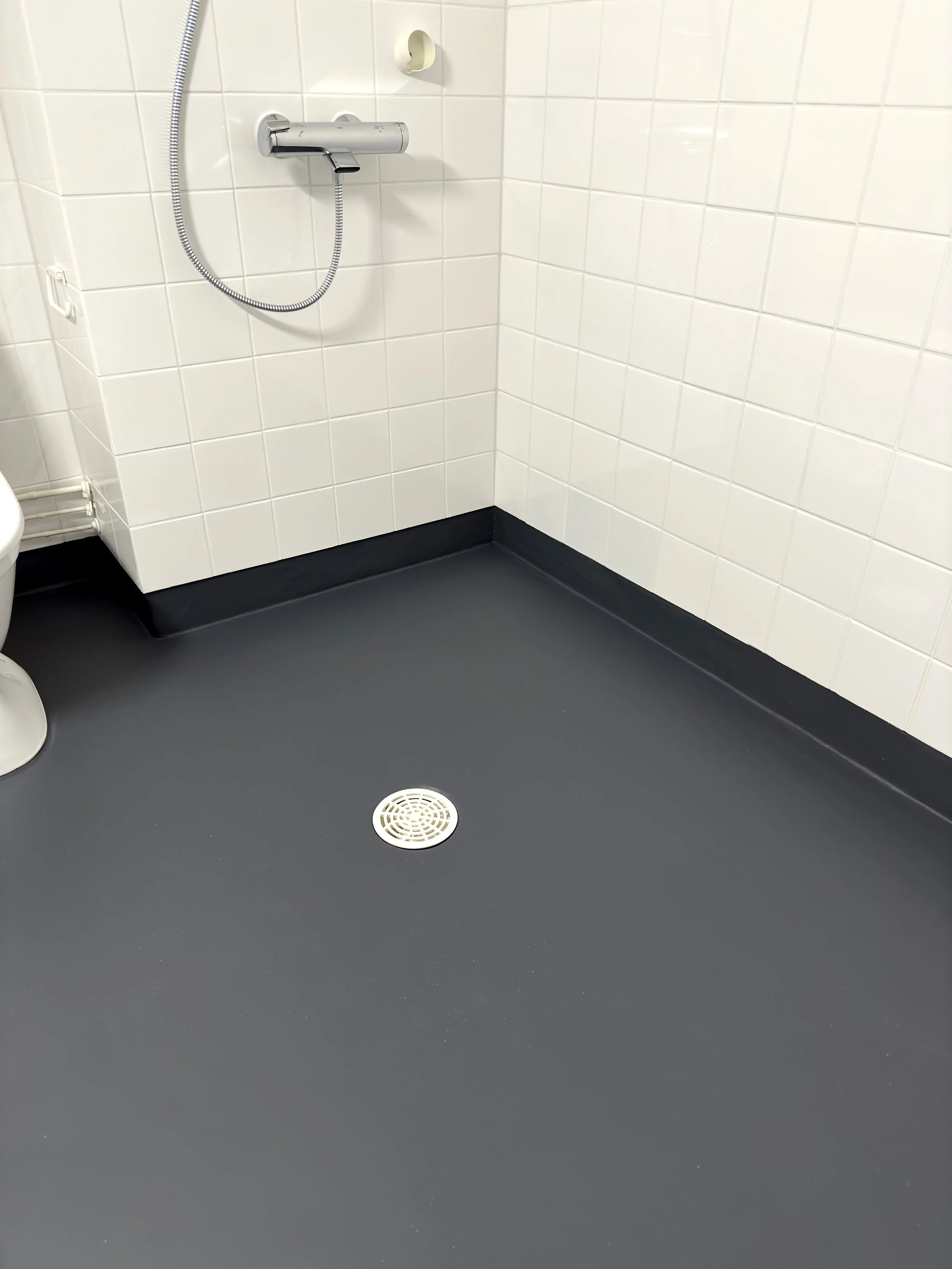 Käsittelemme kylpyhuoneen lattian kestävällä pinnoitteella. Lopputuloksena on saumaton, joustava ja kulutusta kestävä pinta, joka toimii myös vedeneristeenä.